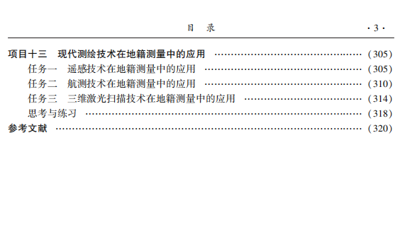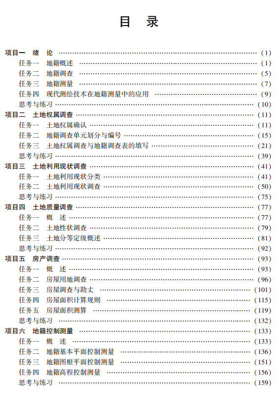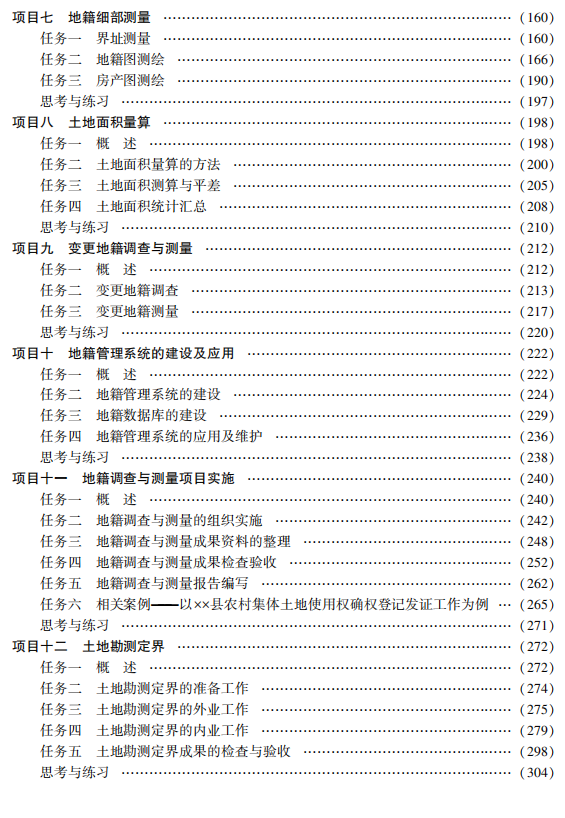 本书为全国测绘地理信息类职业教育“十四五”规划教材。 全书共分 13 个项目,项目一介绍地籍、地 籍调查、地籍测量的基本知识,项目二至项目五阐述土地权属调查、土地利用现状调查、土地质量调查及房 产调查的基本理论和方法,项目六至项目八阐述地籍控制测量、地籍细部测量、土地面积量算的基本原理 和方法,项目九至项目十一阐述变更地籍调查与测量、地籍管理系统的建设及应用、地籍调查与测量项目 实施,项目十二、项目十三论述土地勘测定界、现代测绘技术在现代地籍测量中的应用。 本书可作为高等职业院校工程测量技术专业的教材,也可作为地籍测绘与土地管理信息技术、地理信 息系统与地图制图技术、摄影测量与遥感技术、国土资源调查及其他成人高校相应专业的教材,还可供参 加各类地籍测量竞赛的相关专业师生、参加 1+X 证书考试人员及从事生产和管理人员使用。