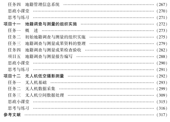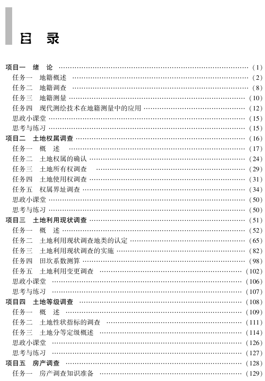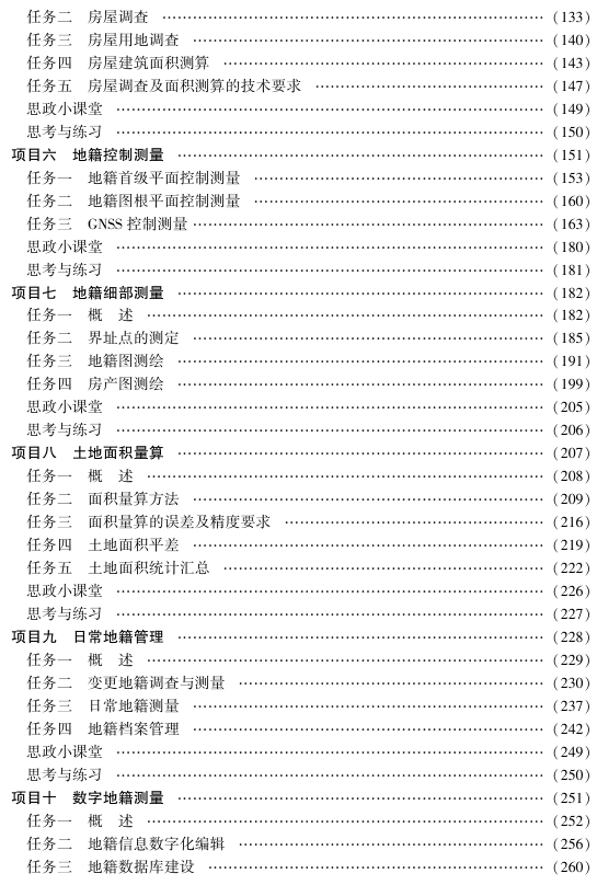 本书根据作者多年的教学及实践经验,参阅了大量的文献资料编写而成。 全书共分十二个项目,项 目一绪论部分介绍了地籍、地籍调查、地籍测量的基本理论;项目二至项目五阐述了土地权属调查、土地 利用现状调查、土地等级调查及房产调查的基本理论和方法;项目六至项目八阐述了地籍控制测量、地 籍细部测量及土地面积量算的基本理论和方法;项目九至项目十二依次阐述了日常地籍管理、数字地籍 测量、地籍调查与测量的组织实施及无人机低空摄影测量在地籍中的应用。 本书为高职高专地籍测量课程教材,也可作为成人教育地籍测量教材。 本书还可作为工程类有关 专业(如GIS、大地测量、测绘工程、测量工程、航测与遥感、土木等)及土地、房地产管理等专业的选修或 参考教材。
