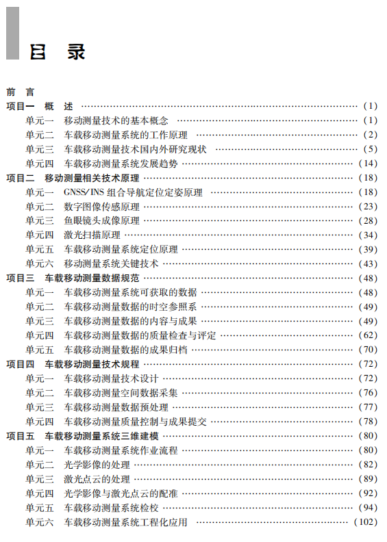 移动测量系统以其全天候数据采集、主动测量、高效便利等优势,在日益增长的三维空间信息需求及日益提高的更新速度要求等方面获得了市场和业界的认可,具有巨大的应用价值和前景。全书共6个项目,以车载平台为主线、背包式平台为辅助,从车载移动测量发展历程出发,详细介绍了车载移动测量的技术原理、数据规范、技术规程及三维建模技术处理流程,并在此基础上,讲述了更高效、更便利的背包式移动测量系统。 本书可作为测绘专业本科生、专科生的基础教材,或作为相关专业的研究生参考教材,也可供从事遥感、GIS 等专业技术人员阅读参考。