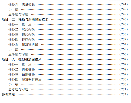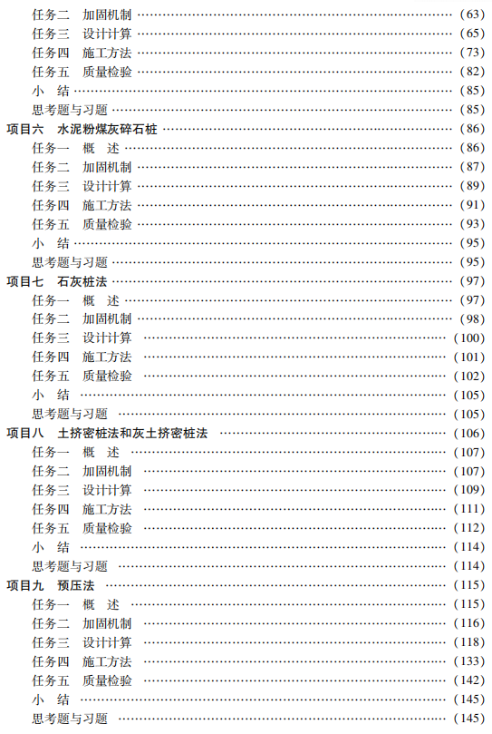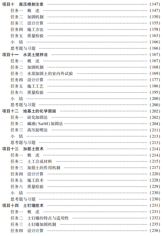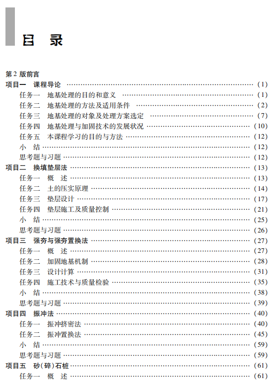 本书为全国高等职业教育地下与隧道工程技术(含基础工程技术)专业“十三五”规划教材之一,依 据中华人民共和国住房和城乡建设部发布的《建筑地基处理技术规范》(JGJ79—2012)编写,主要内容 包括课程导论、换填垫层法、强夯与强夯置换法、振冲法、砂(碎)石桩、水泥粉煤灰碎石桩、石灰桩法、土 挤密桩法和灰土挤密桩法、预压法、高压喷射注浆、水泥土搅拌法、地基土的化学固结、加筋土技术、土钉 墙技术、托换与纠偏加固技术、微型桩加固技术等。 本书主要作为高职高专基础工程、道路与桥梁工程、建筑工程、市政工程、给排水工程、水利工程等 专业以及土建类监理、检测专业的教材,也可作为有关工程技术人员的参考用书。