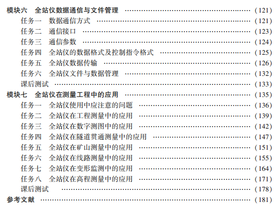 本书为全国测绘地理信息类职业教育“十四五”规划教材。 全书共分 7 个模块, 对全站仪的基本结 构、测量原理、观测方法、功能使用、参数设置、应用技术等方面均作了较详细的介绍。 内容上力求新颖、 简练、系统,深入浅出,通俗易懂,结合实际,适应科技发展方向,符合国家规范标准。 编写顺序上做到使 学习者理解全站仪的概念、了解其工作原理、明确测量功能、熟悉操作步骤、合理设置仪器参数、正确选 择测量模式、掌握应用技术,体现全站仪的特点及完整性和系统性。 本书可供高职工程测量技术、测绘地理信息技术、土木工程、道路与交通工程、地下工程等专业作为 测绘基础、数字测图、控制测量等课程的补充教材,也可供相关专业工程技术人员参考。