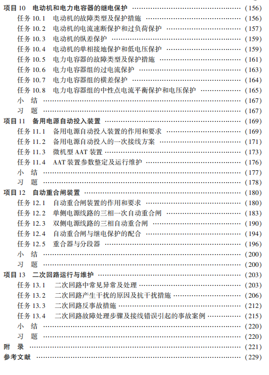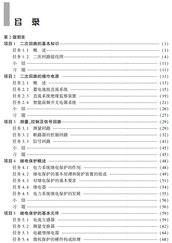 本书是全国高职高专机电类专业创新型规划教材,是根据教育部对高职高专教育的教学基本要求 及全国水利水电高职教研会制定的电气二次部分课程标准编写完成的。 本书主要讲述了电气设备二次 接线的工作原理,主要内容包括:二次回路的基本知识,二次回路的操作电源,测量、控制及信号回路,继 电保护概述,继电保护的基本元件,电网相间短路的电流电压保护、方向电流保护、接地故障保护,电力 变压器的继电保护,电动机和电力电容器的继电保护,变电站的自动装置(如备用电源自动投入、自动重 合闸装置等)原理及应用,二次回路运行与维护等。 本书为高职高专院校供用电技术专业的主干课程教材,也可供变电站及企业用电单位从事电气二 次运行和管理工作的技术人员学习参考。