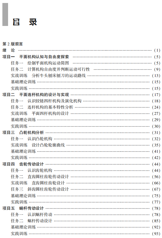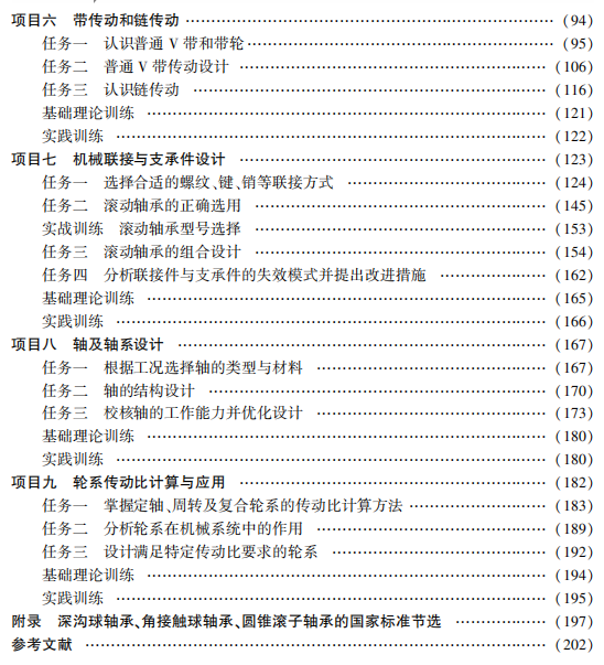 本书是全国高职高专机电类专业规划教材,是根据教育部对高职高专教育的教学基本要求及中国水利教育协会职业技术教育分会高等职业教育教学研究会组织制定的机械设计基础课程标准编写完成的。全书共分为9个项目,即平面机构认知与自由度探索、平面连杆机构的设计与实现、凸轮机构分析齿轮传动设计、蜗杆传动设计,带传动和链传动,机械联接与支承件设计,轴及轴系设计、轮系传动比计算与应用等,每个项目设有学习目标、导人、基础理论训练和实践训练。本书配套有《机械设计实训指导》(另册),后者附有大量的图和表,如最新的国家标准和规范、参考图例、设计题目及答辩题等,便于学生设计时应用。 本书可作为高等职业技术学院,高等专科学校,成人高校等机械,机电及近机类专业的教学用书,也可供社会职业教育培训使用,还可作为各级各类学校相关专业师生的教学参考书。