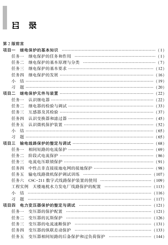 本书是“十四五”“十三五”职业教育国家规划教材, 是按照教育部关于“十四五”“十三五”职业教 育国家规划教材编写基本要求及继电保护员职业标准编写完成的。本书共分7个学习项目,内容主要有 继电保护的基本知识、继电保护元件与装置、输电线路保护的整定与调试、电力变压器保护的整定与调试、 发电机保护的整定与调试、母线保护的整定与调试、发电厂自动装置。为方便教学,全书配套 PPT 教学课 件、微课等教学资源,大部分知识点、技能点制作了微课、视频、动画等数字资源,以二维码的形式在教材的 相关内容中呈现,方便学生利用移动设备随扫随学。 本书可作为高职高专院校发电厂及电力系统专业的教材,也可作为发电厂、变电站、电气类相关课 程的培训教材,还可作为电力工程技术人员的培训教材和参考资料。