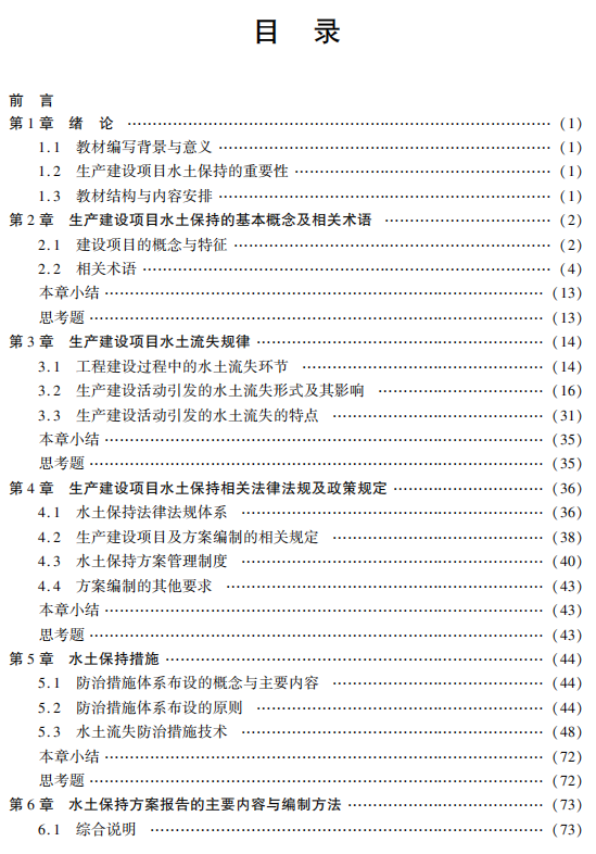本书是全国职业教育生态环境类专业创新型特色教材。 主要介绍了生产建设项目水土保持方案编 制工作的基本概念、理论和实践及其有关知识。 全书共分7章,系统论述了生产建设项目水土保持的基 本概念及相关术语,生产建设项目水土流失规律,生产建设项目水土保持相关法律法规及政策规定,水 土保持措施,水土保持方案报告的主要内容与编制方法,水土保持方案附表、附件和附图。 为了便于学 生巩固所学知识,提高分析与解决问题的能力,本书各章最后还附有相应的思考题。 本书可作为职业本科、高职高专院校等水土保持、水利工程、生态水利工程、农田水利工程、水利工 程施工、水利水电工程建筑等专业的教材,也可供土木建筑类等其他专业、中等职业学校相应专业的师 生及工程技术人员学习参考。