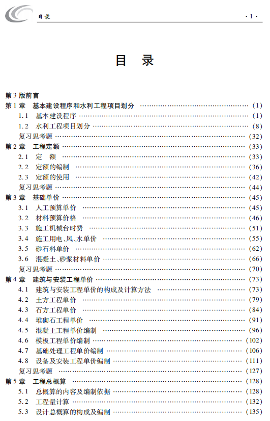 前2版教材基础上修改、补充编纂而成。本书对水利工程造价理论、程序、方法等作了详细的阐述,坚持以就业为导向,突出实用性、实践性;吸取了水利工程造价编制新要求、新方法,其内容的深度和难度按照高等职业教育的特点,重点讲授理论知识在工程实践中的应用,培养高等职业学校学生的职业能力;内容通俗易懂,叙述规范、简练。全书共分8章,包括基本建设程序和水利工程项目划分、工程定额、基础单价、建筑与安装工程单价、工程总概算、水利工程造价其他文件、水利工程工程量清单及计价、水利水电工程招标与投标等。