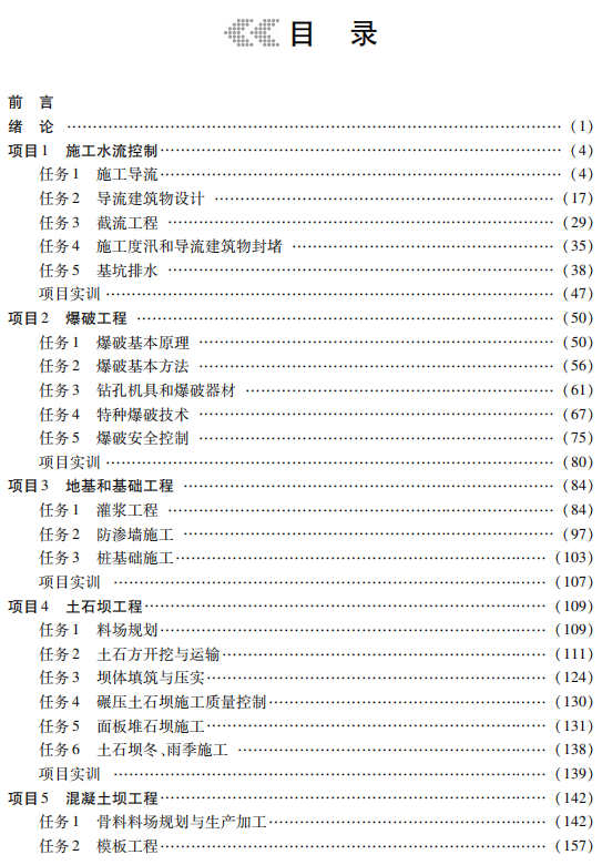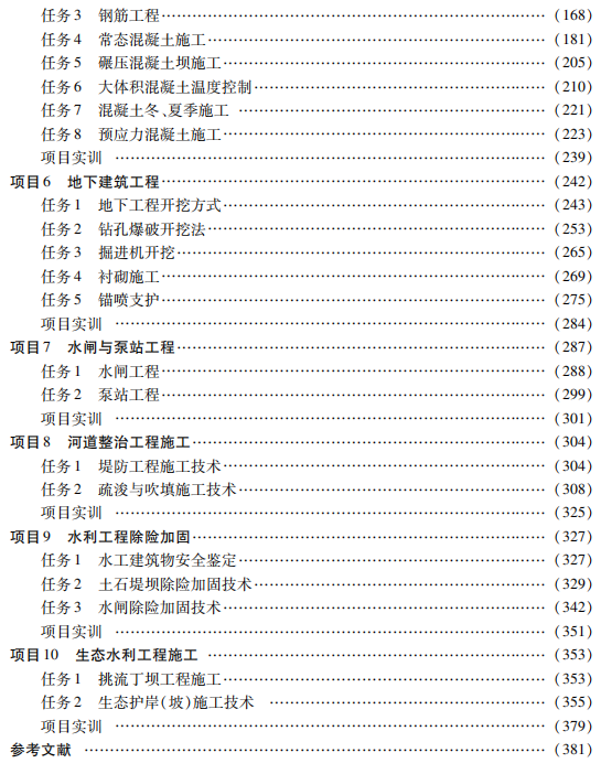 本书是全国水利行业“十三五”规划教材,是根据中国水利教育协会职业技术教育分会高等职业教 育教学研究会制定的水利水电工程施工技术课程标准编写完成的。 全书共有 10 个项目,主要内容包括 施工水流控制、爆破工程、基础处理工程、土石坝工程、混凝土坝工程、地下建筑工程、水闸与泵站工程、 堤防与河道疏浚工程、水利工程除险加固、生态水利工程施工等。 本书可供高职高专水利类(水利水电建筑工程、水利水电工程技术、水利水电工程管理、水利工程 等)专业教学使用,也可供水利类相关专业教学使用及相关专业工程技术人员学习参考。