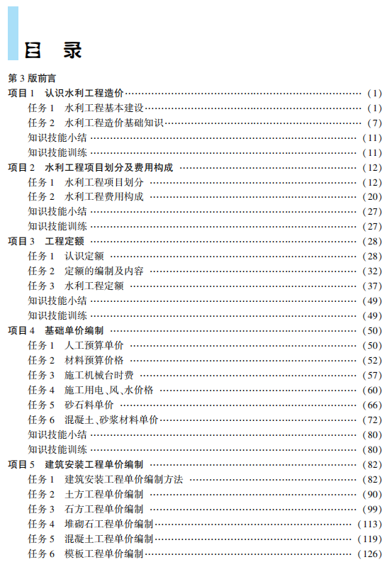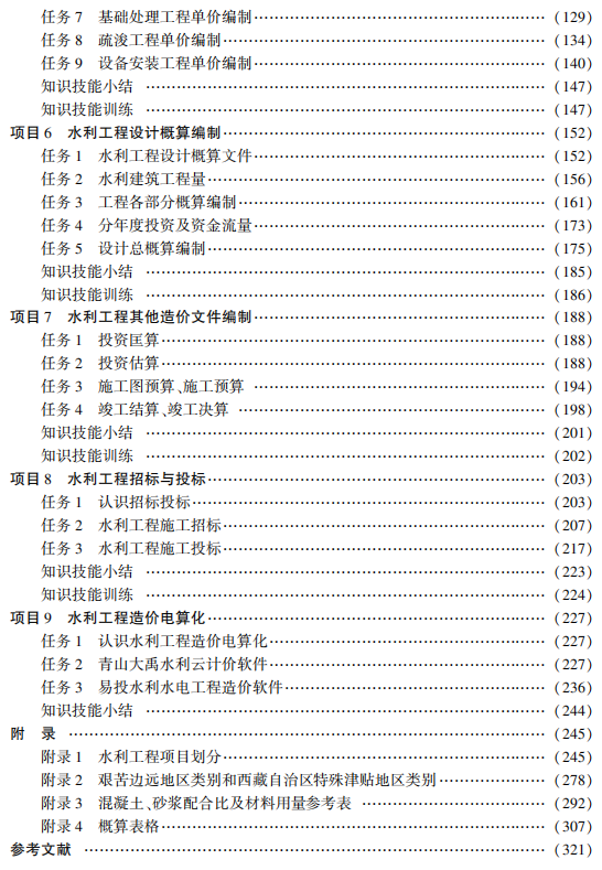 本书是“十四五”“十三五”职业教育国家规划教材、“十四五”时期水利类专业重点建设教材,是根 据教育部关于职业教育国家规划教材编写要求及相关行业课程标准编写完成的。 全书主要内容包括认 识水利工程造价、水利工程项目划分及费用构成、工程定额、基础单价编制、建筑安装工程单价编制、水 利工程设计概算编制、水利工程其他造价文件编制、水利工程招标与投标、水利工程造价电算化等。 本 书融入了党的二十大精神等思政元素,配套有 PPT 教学课件、习题、文档、视频、案例等教学资源,对重要 知识点、技能点制作了微课视频等数字资源,并以二维码的形式在教材的相关内容中呈现,学习者可利 用移动设备随扫随学。 本书可作为高等职业院校水利水电建筑工程、水利工程、水利水电工程技术、水利水电工程智能管 理、智慧水利技术等专业的教材,也可供水利大类专业教师和从事相关专业的工程技术人员参考使用。