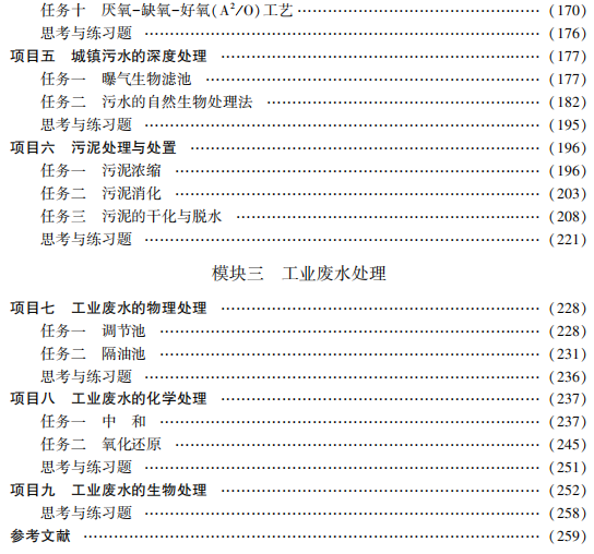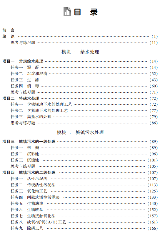 本书是全国水利行业规划教材,国家级职业教育教师创新团队建设教材,国家精品在线开放课程和国家课程思政示范课程配套教材,是根据国家职业教育环境保护类和水利类专业教学标准及水处理工程技术相关的规范、标准、规程等编写完成的。全书共分为九个学习项目,即常规给水处理,特殊水处理、城镇污水的一级处理,城镇污水的二级处理,城镇污水的深度处理,污泥处理与处界,工业废水的物理处理、工业废水的化学处理,工业废水的生物处理等。每个学习项目下有多个任务及思考与练习题融合了课程思政元素和职业技能等级证书的要求。为方便教学,本书配套有 PPT 教学课件,增加了虚拟仿真实训项目,书中大部分知识点,技能点制作了微课视频,动画等数字资源,以二维码的形式在教材的相关内容中呈现,方便学生利用移动设备随扫随学。本书主要作为高职高专环境工程技术,水净化与安全技术等环境保护类专业,以及智能水务管理水生态修复技术等水利类相关专业的教材,也可作为有关工程技术人员的参考用书。