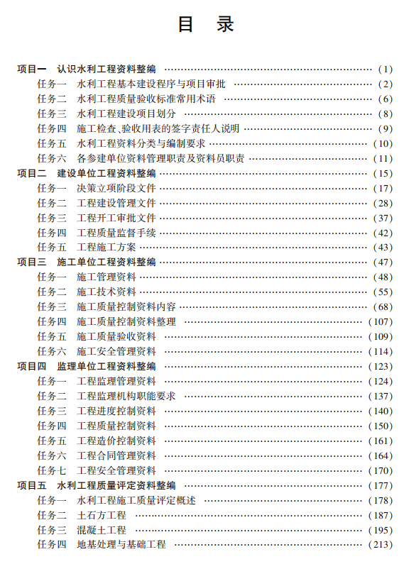 本书是“十四五"时期水利类专业重点建设教材(职业教育),是在中国水利教育协会的指导下,按照职业教育水利工程资料整编课程教学标准编写完成的。本书主要内容包括认识水利工程资料整编建设单位工程资料整编、施工单位工程资料整编、监理单位工程资料整编、水利工程质量评定资料整编水利工程竣工验收资料整编,水利工程资料信息管理系统等,共七个学习项目。各项目学习内容均明确知识目标,能力目标和素质目标,并附技能训练及微课资源,是传统纸质教材与数字资源相结合的融媒体新形态教材。 本书可作为职业教育水利水电工程技术、水利水电建筑工程,水利工程,智慧水利技术等专业师生的教学参考书,也可供资料、质检、试验、施工、安全、监理等相关工程技术人员参考使用。
