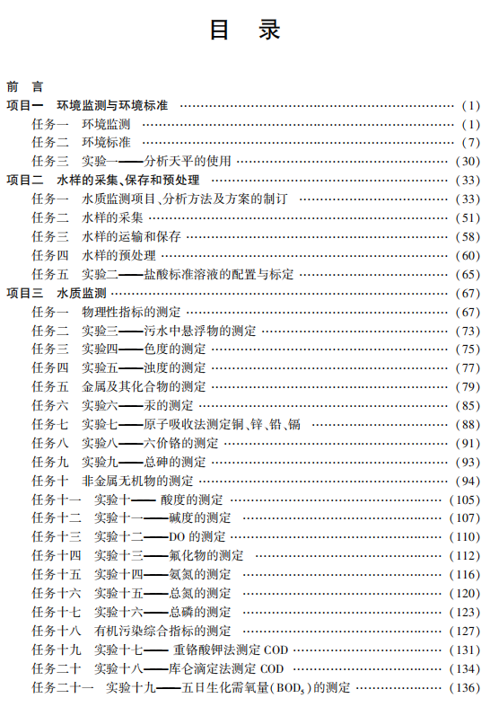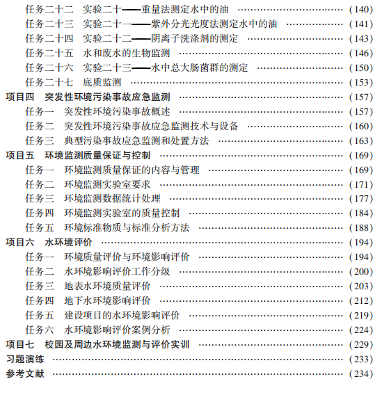本书根据教育部对职业院校专业人才培养的指导意见和高职高专环保与气象类专业教学指导委员 会审定通过的《水环境监测与评价教学大纲》编写而成。 本书以水环境监测与评价方案的编写为主线, 主要内容有环境监测与环境标准,水样的采集、保存和预处理,水质监测,突发性环境污染事故应急监 测,环境监测质量保证与控制,水环境评价,校园及周边水环境监测与评价实训等。 本书内容对接绿色 环保战略性新兴产业和水利行业相关岗位的典型任务,坚持“岗课赛证”相融合的原则,具有实用性、生 产实践性强等特点,以项目为驱动组织教学内容,将教学内容的理论知识模块化,通过理论与实践相结 合的方式,使学生加深对理论知识的理解和应用,实施理论与实践一体化的项目教学模式。 本书既可作为高职高专院校环境保护类专业和水利类相关专业的教学用书,也可作为从事水资源、 水环境保护等相关行业的专业技术人员的培训用书及参考书。