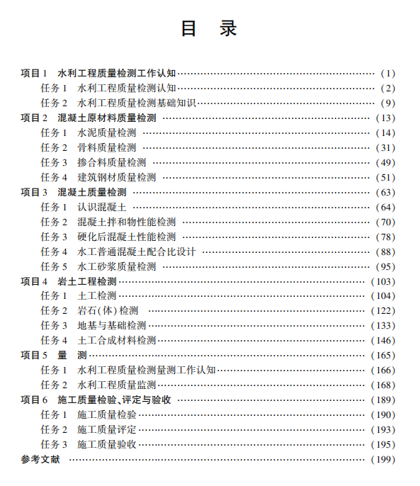 本书是“十四五”时期水利类专业重点建设教材(职业教育),是在中国水利教育协会的指导下,按 照职业教育相关教学标准编写完成的。 本书以水利工程质量检测为视角,结合水利工程质量检测实践, 按照质检员工作岗位要求编写完成,共分6个项目,主要内容包括水利工程质量检测工作认知,混凝土 原材料质量检测,混凝土质量检测,岩土工程检测,量测,施工质量检验、评定与验收等,涵盖了水利工程 质量检测的主要项目。 各项目学习内容均明确知识目标、技能目标和思政目标,并附微课等资源,是传 统纸质教材与数字资源相结合的融媒体新形态教材。 本书可作为职业教育水利水电工程技术、水利水电工程智能管理、水利水电建筑工程等专业师生的 教学参考书,也可供水利行业相关技术人员参考使用。