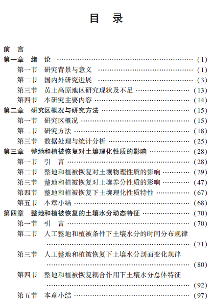 本书通过野外监测与室内分析,系统探讨了整地措施与植被恢复对黄土高原地区土壤理 化性质及水文循环的影响。 书中以甘肃省定西市龙滩流域为研究区域,全面分析了不同整地 方式(如水平沟、鱼鳞坑、反坡台等)及植被类型(如柠条、油松、侧柏等)对土壤水分、养分动 态、减流减沙效益、土壤碳储量等生态水文效应的影响。 研究结果表明,整地措施能显著提高 土壤的保水供水能力,尤其在干旱季节能有效改善土壤水分状况,同时不同植被类型也表现 出各自独特的水文效应。 全书通过定量分析与模型建立,深入探讨了整地与植被恢复在减缓 水土流失、改善生态环境方面的协同作用,揭示了二者对生态系统服务功能的提升机制。 本书为黄土丘陵区的生态修复与水土保持提供了科学依据和技术支持,适合生态恢复、 土壤水文、环境保护等领域的科研人员和工程技术人员阅读参考。