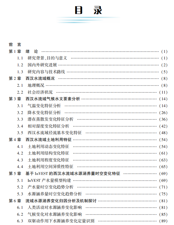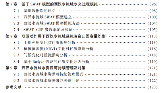 本书以甘肃境内长江流域二级支流西汉水流域为研究对象,分析流域气候水文要素和土地利用变 化特征,定量评估流域水文涵养能力及其演变特征,识别影响流域水文涵养能力的驱动要素,搭建西汉 水流域SWAT水文模型,模拟分析流域径流演变特征,定量识别双驱动作用下流域径流变化的贡献,以 期为流域水资源合理利用、水土流失治理、生态环境改善等提供借鉴。 本书可供从事气候变化、生态水文、水资源利用的工程技术人员以及相关领域的研究人员参考。