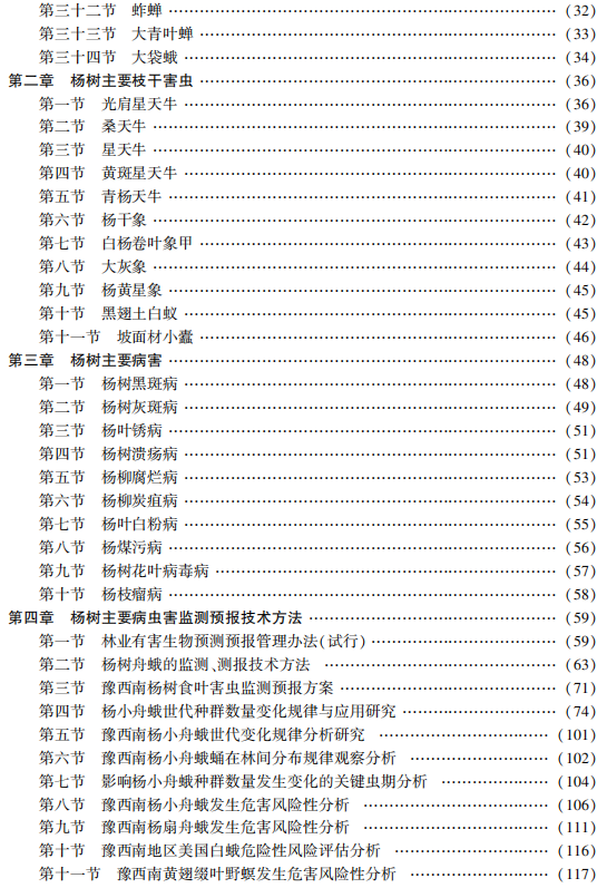 本书系统总结了20多年来的豫西南杨树主要病虫害监测防治技术研究成果?立足南阳市南北过渡 兼具的气候特点?查阅相关文献?选录吸收部分最新研究成果?本书共分五章?系统地介绍了杨树主要食 叶害虫、枝干害虫、主要病害的形态特征、生物学、生态学习性和防治方法?介绍了杨树主要病虫害监测 预报和防治技术研究成果? 本书是一部专项研究杨树主要病害虫的重要论著?具有较高的学术应用价值?内容详细全面?理论 联系实际?可供广大林业生产、科研、教学人员以及政府制定林业生产政策参考使用?是林业生产活动实 用性很强的技术指导参考书?