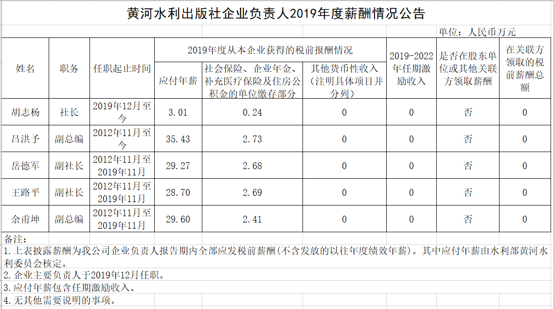 黄河水利出版社企业负责人2019年度薪酬情况公告