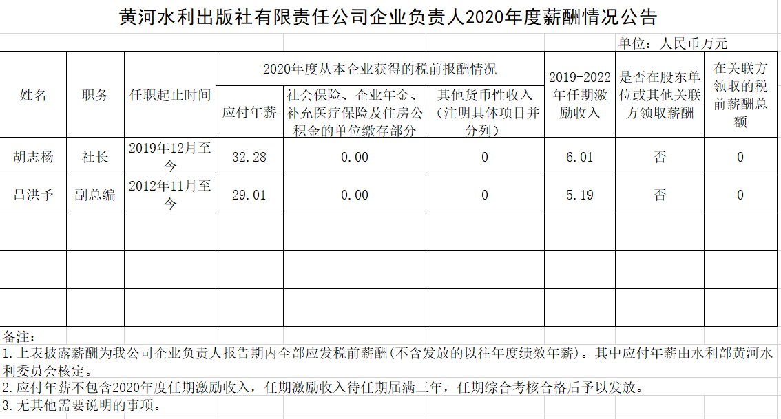 黄河水利出版社企业负责人2020年度薪酬情况公告