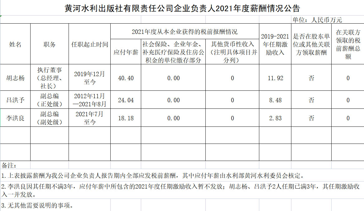 黄河水利出版社有限责任公司企业负责人2021年度薪酬情况公告
